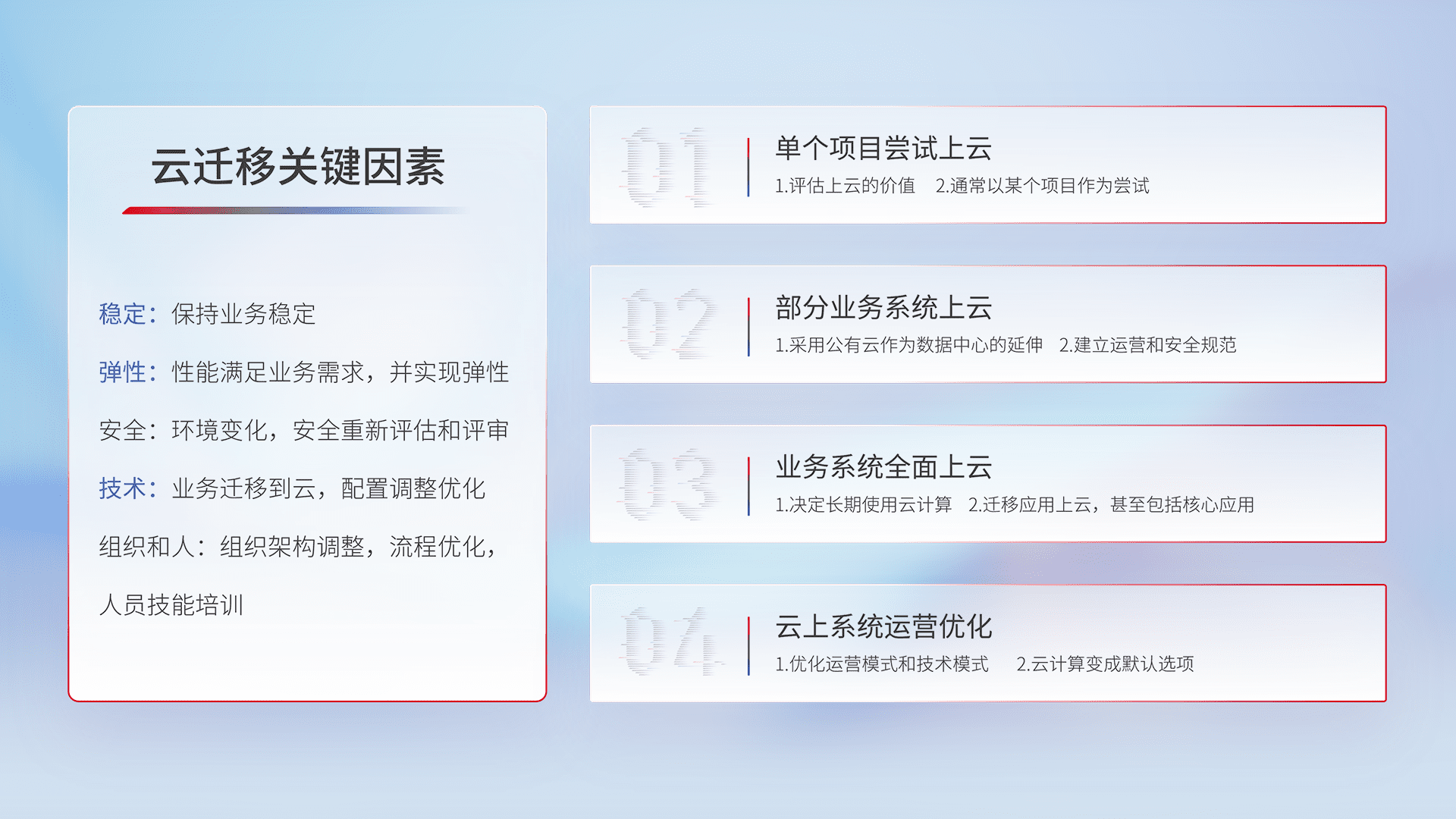 结合实际业务,,,从规划设计、、、云平台选型、、云原生改造、、、、数据迁移、、、集成交付,,,迁移全过程为客户识别最佳上云路径,,做好风险识别管理,,,设计网络架构、、、身份权限、、、、安全审计合规、、、、操作审计、、日志审计、、、、监控告警策略、、多站点容灾设计等,,,,对云上基础设施进行整体规划,,,,提升IT治理水平,,,以满足弹性、、、、高可用、、、高性能的需求。。。。
