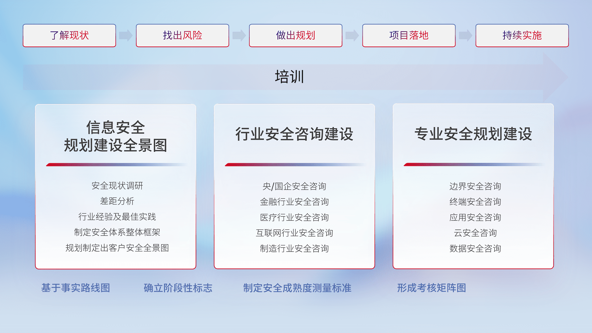 梳理客户信息安全现状调研、、、、差距分析结果,,,,结合行业先进经验及最佳实践,,制订客户的信息安全管控体系总结架构,,,,最终形成一个完整的客户信息安全规划与建设的全景图。。